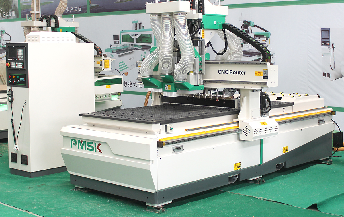 1機(jī)器接通電源,加工臺面上上放好藍(lán)色刨花板。