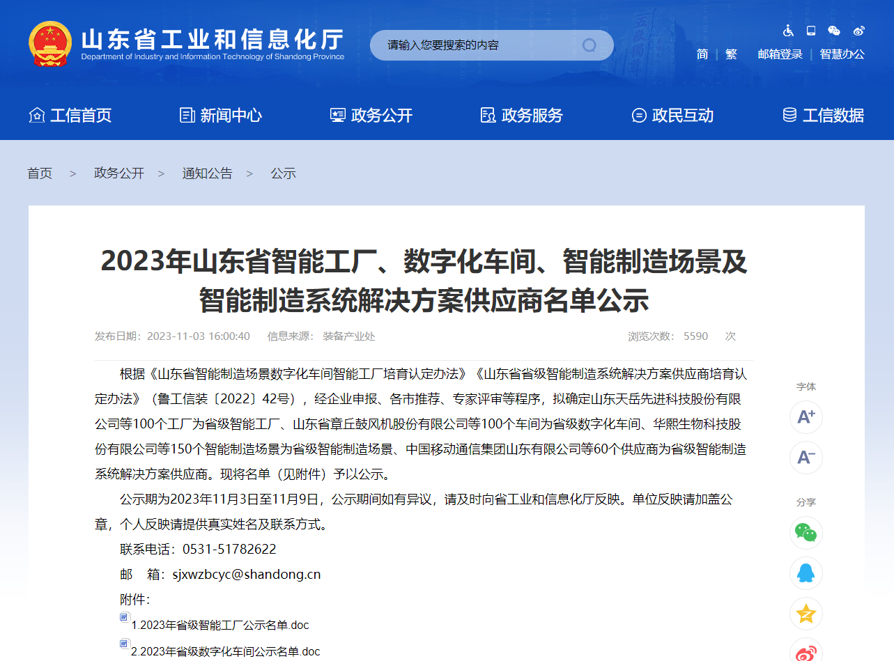2023年11月3日,山東省工業(yè)和信息化廳公布了2023年山東省智能工廠、數(shù)字化車間、智能制造場景及智能制造系統(tǒng)解決方案供應商名單,中品智能機械有限公司工業(yè)4.0數(shù)控裝備智能工廠入選2023年山東省智能工廠名單。