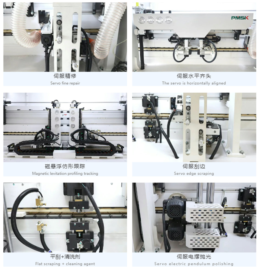 The servo edge scraping mechanism can automatically adjust its position according to the thickness of the edge banding tape to achieve perfect edge trimming.